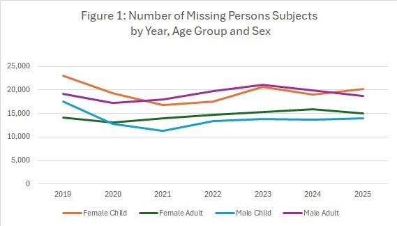 The overall number of persons who went missing decreased by 1% in 2025, from 69,152 subjects in 2024 to 68,349 in 2025, bringing the total number to 8% lower than it was pre-COVID (i.e. 2019). Figure 1 highlights that the most dramatic impact observed during the pandemic was on the number of missing children (under 18 years of age), where the number of missing children has still not yet risen back to pre-COVID levels. The number of missing adults has been above the 2019 levels for the past four years. While missing female adults have exceeded 2019 numbers since 2022, missing male adults did not exceed their 2019 numbers this year, with 512 fewer subjects.