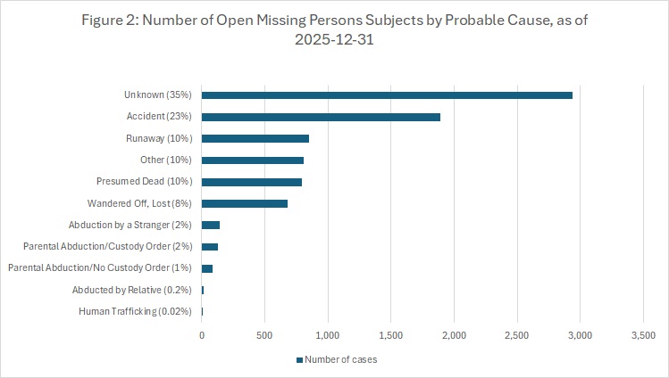 Figure 2: Number of open missing persons subjects by probable cause, as of 2025-12-31